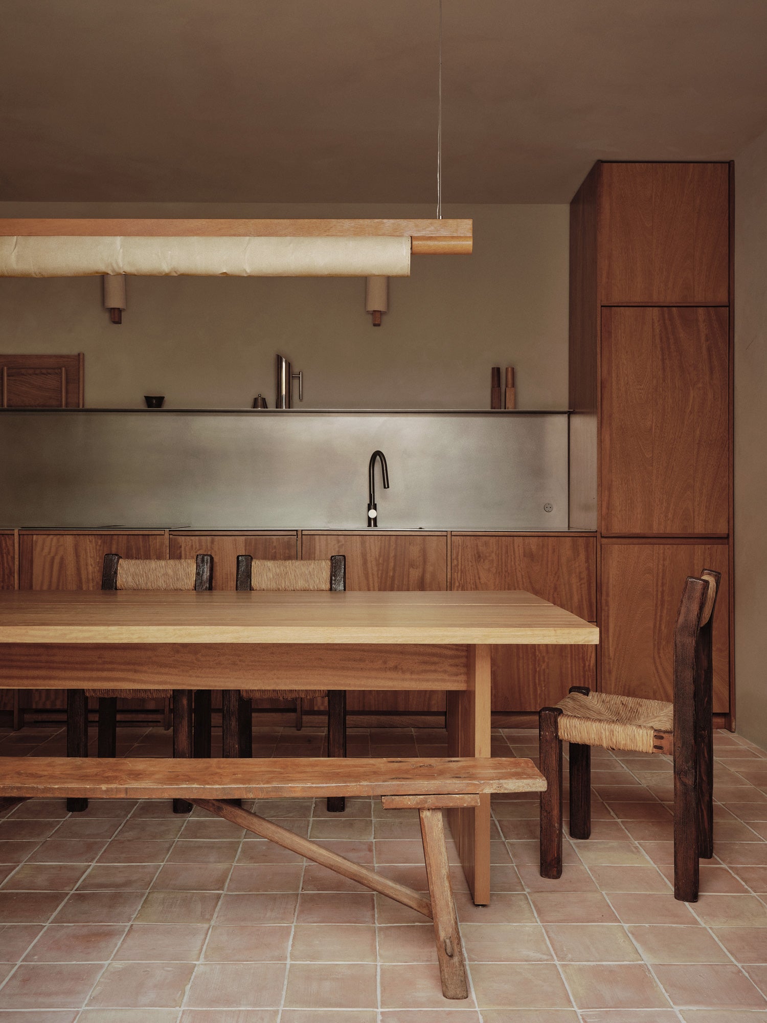 We designed every element of the house as a meeting point between past and present: the kitchen, the custom-made 240 cm high doorways with deep door frames, the storage units, from the workshop to bathrooms. Work tables, were shaped with the same intention, echoing the strength of the structure while introducing the warmth of our collection.
